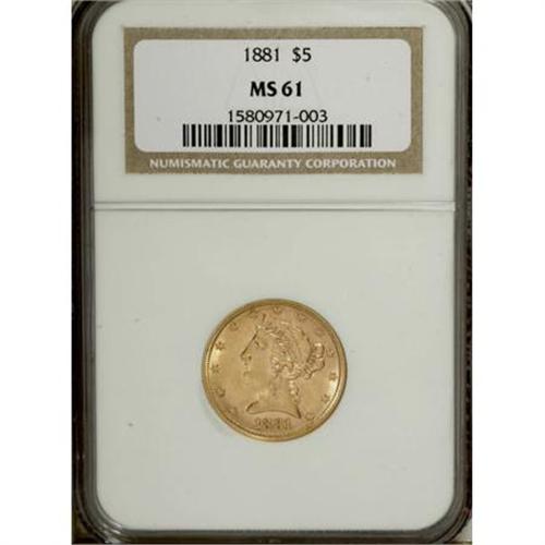 <B>1881 $5 MS61 NGC.</B></I> NGC Census: (2627/6008). PCGS Population (1069/2719). Mintage: 5,708,802. Numismedia Wsl. Price for NGC/PCGS coin in MS61: $280. (#8354)<BR><BR><B>Coin Engraver:</B> Christian Gobrecht<BR><BR><b>Shipping:</b> Coins & Currency (<a target="_blank" href="http://www.heritageauctions.com/common/shipping.php">view shipping information</a>)