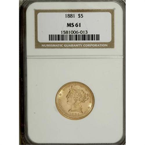 <B>1881 $5 MS61 NGC.</B></I> NGC Census: (2637/6041). PCGS Population (1072/2748). Mintage: 5,708,802. Numismedia Wsl. Price for NGC/PCGS coin in MS61: $295. (#8354)<BR><BR><B>Coin Engraver:</B> Christian Gobrecht<BR><BR><b>Shipping:</b> Coins & Currency (<a target="_blank" href="http://www.heritageauctions.com/common/shipping.php">view shipping information</a>)
