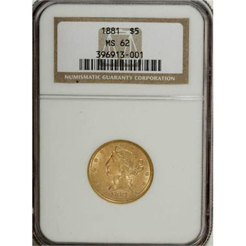 <B>1881 $5 MS62 NGC.</B></I> NGC Census: (3581/2460). PCGS Population (1686/1076). Mintage: 5,708,802. Numismedia Wsl. Price for NGC/PCGS coin in MS62: $340. (#8354)<BR><BR><B>Coin Engraver:</B> Christian Gobrecht<BR><BR><b>Shipping:</b> Coins & Currency (<a target="_blank" href="http://www.heritageauctions.com/common/shipping.php">view shipping information</a>)