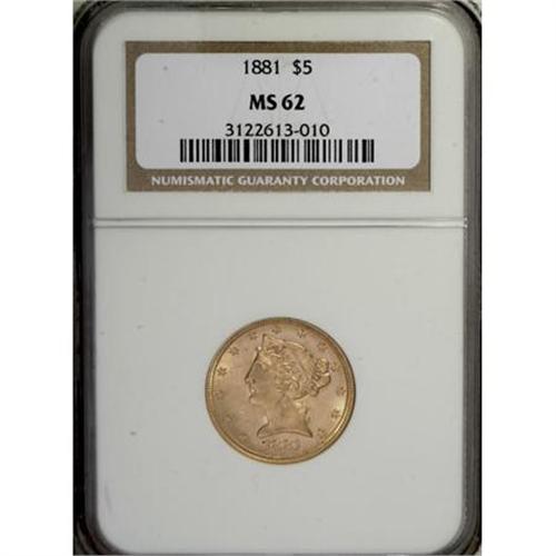 <B>1881 $5 MS62 NGC.</B></I> . NGC Census: (3741/2520). PCGS Population (1703/1104). Mintage: 5,708,802. Numismedia Wsl. Price for NGC/PCGS coin in MS62: $365. (#8354)<BR><BR><B>Coin Engraver:</B> Christian Gobrecht<BR><BR><b>Shipping:</b> Coins & Currency (<a target="_blank" href="http://www.heritageauctions.com/common/shipping.php">view shipping information</a>)