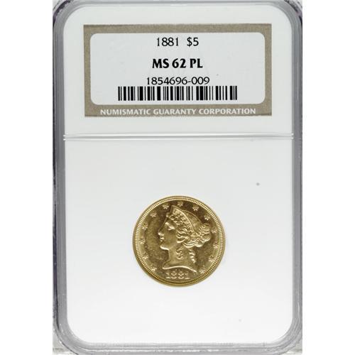 1881 $5 MS62 Prooflike NGC. This beautiful yellow-oran
