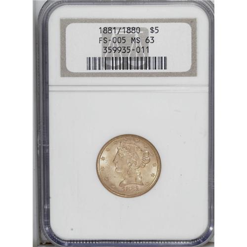1881 $5 MS63 NGC. FS-301, formerly FS-005. The overdat