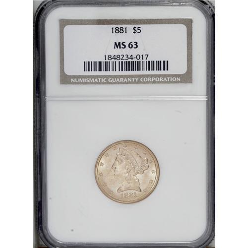 1881 $5 MS63 NGC. This yellow-gold example has vibrant