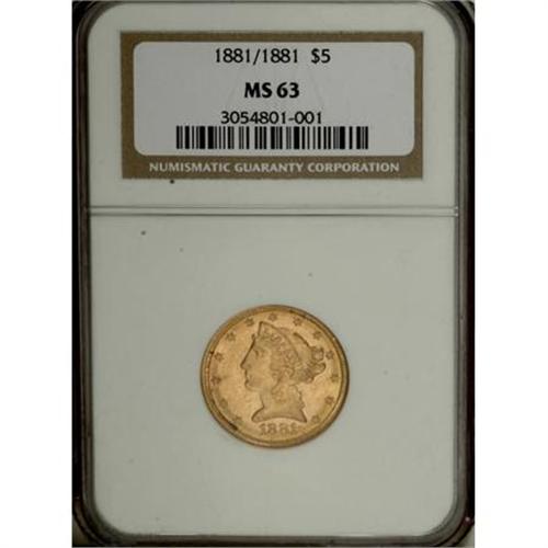 <B>1881/1881 $5 MS63 NGC.</B></I> FS-302. Although the 1881/1880 gets all the glory, there are several interesting repunched date varieties for the 1881. The 881 is obviously repunched on the present <I>Cherrypickers'</B></I> variety. Well struck and only lightly abraded with minor carbon near the rims.<BR><BR><B>Coin Engraver:</B> Christian Gobrecht<BR><BR><b>Shipping:</b> Coins & Currency (<a target="_blank" href="http://www.heritageauctions.com/common/shipping.php">view shipping information</a>)