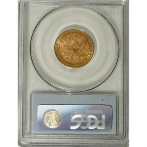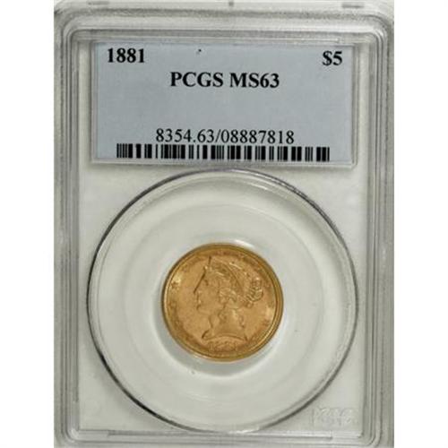 <B>1881 $5 MS63 PCGS.</B></I> Solidly struck with strongly lustrous centers and rings of deeper, opaque patina at the margins. An interesting example of this popular type issue, attractive despite the minor, scattered abrasions that account for the grade.<BR><BR><B>Coin Engraver:</B> Christian Gobrecht<BR><BR><b>Shipping:</b> Coins & Currency (<a target="_blank" href="http://www.heritageauctions.com/common/shipping.php">view shipping information</a>)