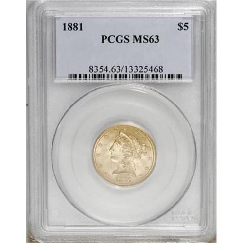 <B>1881 $5 MS63 PCGS.</B></I> PCGS Population (881/209). NGC Census: (1870/622). Mintage: 5,708,802. Numismedia Wsl. Price for NGC/PCGS coin in MS63: $1,125. (#8354)<BR><BR><B>Coin Engraver:</B> Christian Gobrecht<BR><BR><b>Shipping:</b> Coins & Currency (<a target="_blank" href="http://www.heritageauctions.com/common/shipping.php">view shipping information</a>)