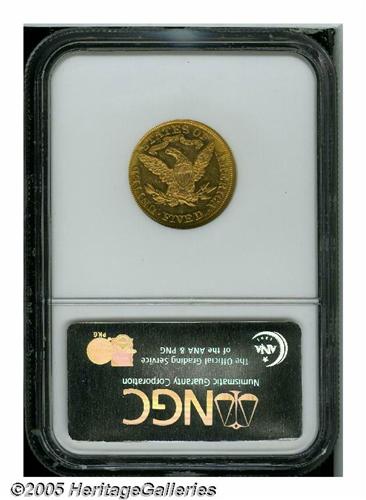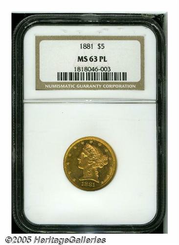 <B>1881<$5> MS63 Prooflike NGC.</B></I> A well struck and moderately mirrored type coin, toned in bright honey-gold hues. A moderate mark in the field near the nose does not deny the eye appeal. Just four pieces have been encapsulated as Prooflike by NGC, as of (5/05), and this coin is tied with one other for finest certified among the quartet.