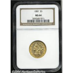 <B>1881<$5> MS64 NGC.</B></I> Well detailed with ample mint frost and tinges of olive-gold patina about the borders. The 1881 is a more obtainable issue at this grade level, but the supply of Gems is greatly reduced. <BR><BR><B>Important notice:</B> Heritage usually auctions material at the rate of 200-250 lots per hour. On some occasions eBay Live bid software or the Internet may not be able to keep up with the pace of the auction. We recommend placing a realistic absentee bid now as insurance to avoid disappointment. Occasionally the auctioneer may eliminate or reject an eBay Live bid, and the auctioneer may also reopen a lot after the close of the eBay live bidding (usually because we missed an audience bid), and may reject your bid even if it shows you as the winning bidder. By bidding via eBay Live, you agree that Heritage may award the lot to another bidder at its sole discretion under the circumstances described above or any other reasonable circumstances. Since eBay bids are not shown to us until we open the lot on the floor, we treat those bids just like floor bids. In most cases the floor responds before the eBay bid is presented to us, due to Internet lag time, so for consistency we have made it a policy that floor bids are always considered first over tie eBay live bids. Also please note that all Heritage lots purchased through eBay Live carry a 20% Buyer's Premium. Please make sure you read the Terms and Conditions before you bid.