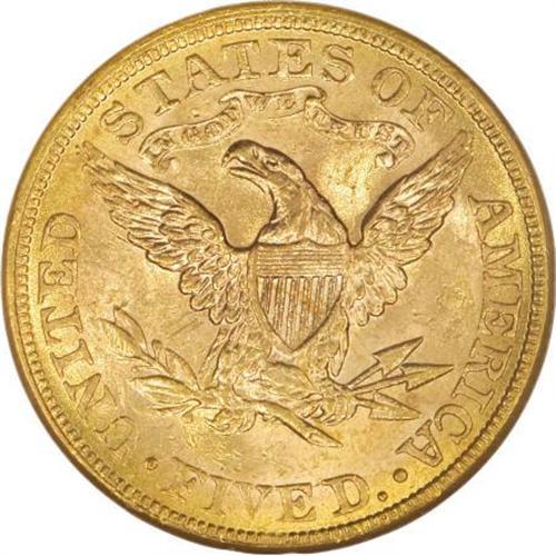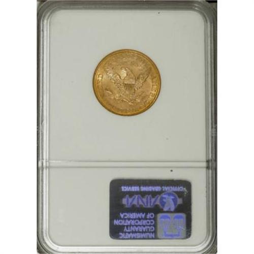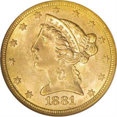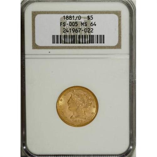 <B>1881/0 $5 MS64 NGC.</B></I> FS-301, formerly FS-005. The fourth edition of <I>The Cherrypickers Guide, </B></I>volume II, notes that this variety is actually an 1881/1880 overdate and that, from the appearance of the repunching, each date was part of a four-digit logo punch. The 1 and second 8 are boldly repunched, the first 8 less so, and the curves of the 0 are apparent, rising upward from each side of the last 1. This is a lustrous piece with peach-gold, distraction-free surfaces and a sharp strike. There are none graded finer at either service. Census: 3 in 64, 0 finer (7/07).<BR><BR><B>Coin Engraver:</B> Christian Gobrecht<BR><BR><b>Shipping:</b> Coins & Currency (<a target="_blank" href="http://www.heritageauctions.com/common/shipping.php">view shipping information</a>\)
