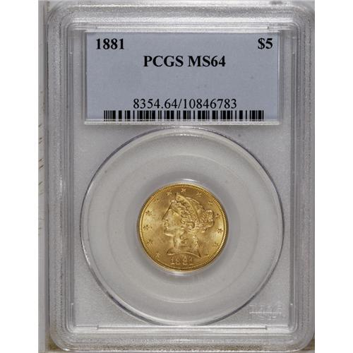 1881 $5 MS64 PCGS. The lustrous obverse is straw-gold,