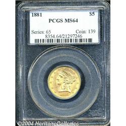 <B>1881<$5> MS64 PCGS.</B></I> Lustrous and original with an overall bold impression, the surfaces are free of only a few light traces of coin-to-coin contact. <BR><BR><B>Important notice:</B> Heritage usually auctions material at the rate of 200-250 lots per hour. On some occasions eBay Live bid software or the Internet may not be able to keep up with the pace of the auction. We recommend placing a realistic absentee bid now as insurance to avoid disappointment. Occasionally the auctioneer may eliminate or reject an eBay Live bid, and the auctioneer may also reopen a lot after the close of the eBay live bidding (usually because we missed an audience bid), and may reject your bid even if it shows you as the winning bidder. By bidding via eBay Live, you agree that Heritage may award the lot to another bidder at its sole discretion under the circumstances described above or any other reasonable circumstances. Since eBay bids are not shown to us until we open the lot on the floor, we treat those bids just like floor bids. In most cases the floor responds before the eBay bid is presented to us, due to Internet lag time, so for consistency we have made it a policy that floor bids are always considered first over tie eBay live bids. Also please note that all Heritage lots purchased through eBay Live carry a 20% Buyer's Premium. Please make sure you read the Terms and Conditions before you bid.