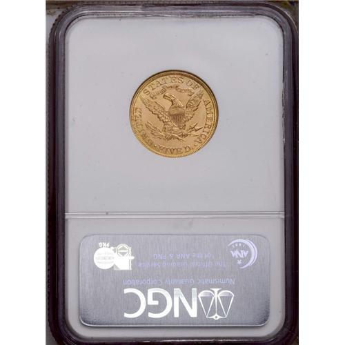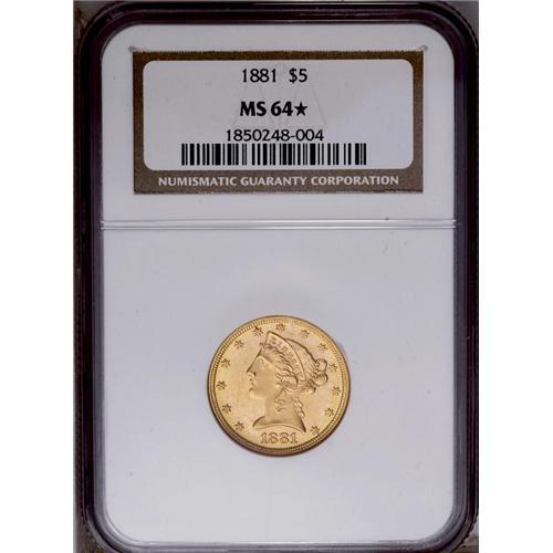 <B>1881<$5> MS64 <img border='0' src='http://www.heritagecoins.com/images/star.gif' width=10 height=10> NGC.</B></I> This pinpoint-sharp example has reflective fields, although the borders demonstrate cartwheel luster. Two dramatically different kinds of luster on the same coin is unusual for a Liberty half eagle. A few tiny marks on the left obverse field decide the grade.
