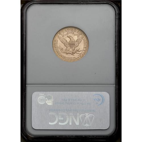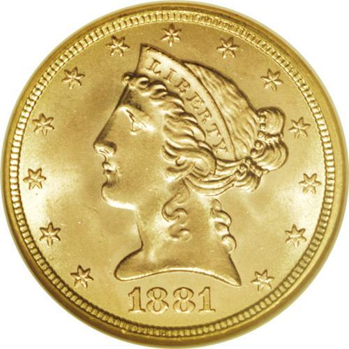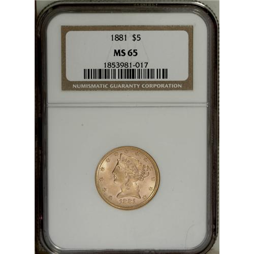 <B>1881 $5 MS65 NGC.</B></I> Booming luster brightens this sharply struck and nicely preserved tawny-gold Gem. The base of the second 8 is broken, as made from a defective logotype punch. The 1881 is the highest mintage half eagle, but is significantly scarcer at the MS65 level than such later issues as the 1901-S and 1903-S.<BR><BR><b>Shipping:</b> Coins & Currency (<a target="_blank" href="http://www.heritageauctions.com/common/shipping.php">view shipping information</a>)