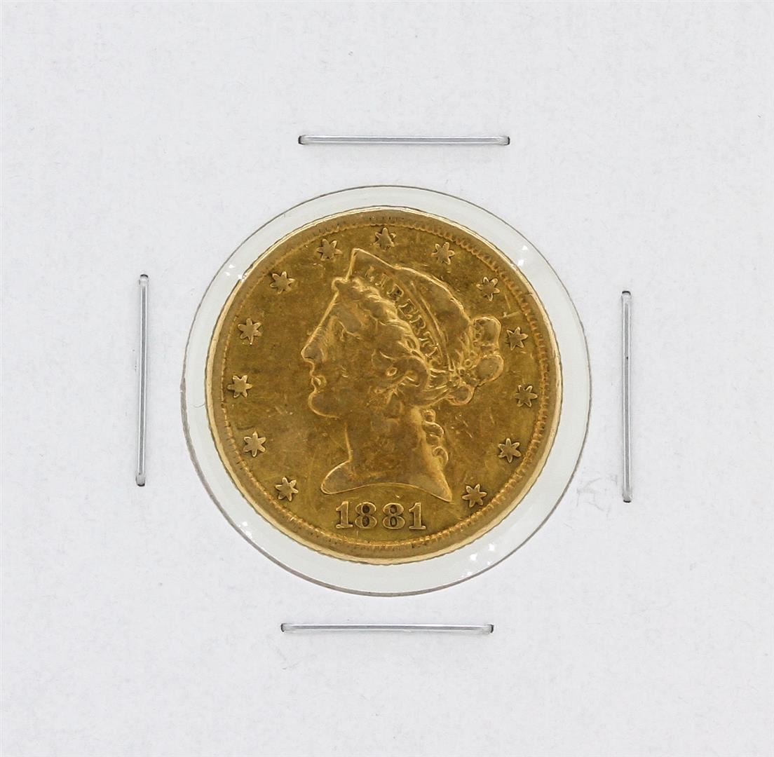 One 1881 $5 VF Liberty Head Half Eagle Gold Coin.