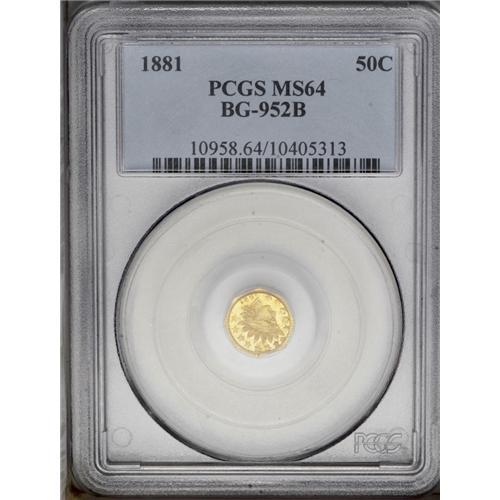 <B>1881<50C> Indian Octagonal 50 Cents, BG-957, Low R.6, MS64 PCGS.</B></I> Misattributed by PCGS as BG-952B, a.k.a. BG-957A. The same die pair was used to strike BG-952B, but CAL has largely been effaced from the die. A flashy and well preserved representative with minor striking incompleteness on the central reverse.