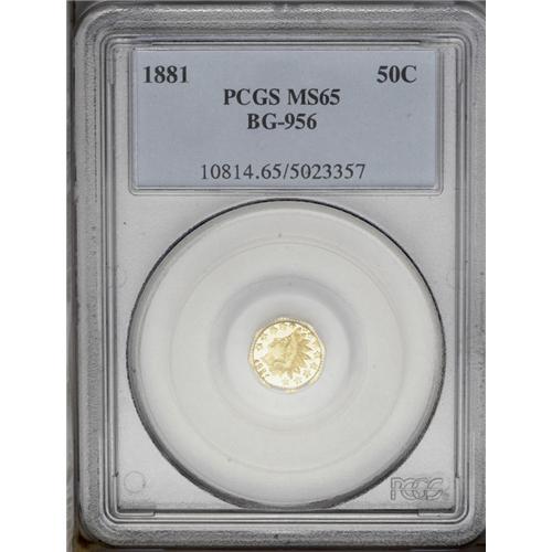 <B>1881<50C> Indian Octagonal 50 Cents, BG-956, High R.4, MS65 PCGS.</B></I> A noticeably prooflike example exhibiting sharp definition overall. A diagonal die line crosses the lower half of the Indian's neck, and a heavy die crack bisects the reverse, essentially through the center. A slight green-golden appearance enhances each side, and about 90 degrees of clockwise die rotation is also noted. Conditionally rare as a Gem. Population: 5 in 65, 0 finer (4/06).