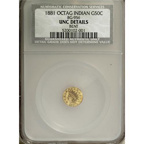 <B>1881 50C Indian Octagonal 50 Cents, BG-956, High R.4,--Bent--NCS. UNC Details.</B></I> NGC Census: (0/2). PCGS Population (2/48). (#10814)<BR><BR><b>Shipping:</b> Coins & Currency (<a target="_blank" href="http://www.heritageauctions.com/common/shipping.php">view shipping information</a>)