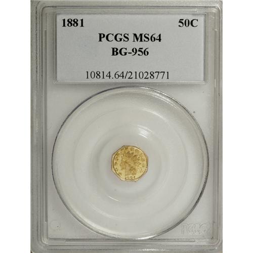 <B>1881 50C Indian Octagonal 50 Cents, BG-956, High R.4, MS64 PCGS.</B></I> PCGS Population (30/5). NGC Census: (0/0). (#10814)<BR><BR><b>Shipping:</b> Coins & Currency (<a target="_blank" href="http://www.heritageauctions.com/common/shipping.php">view shipping information</a>)