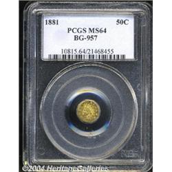<B>1881<50C> Indian Octagonal 50 Cents, BG-957, Low R.6, MS64 PCGS.</B></I> Peach and olive-gold hues grace this crisply struck and beautifully preserved near-Gem. CAL is partially effaced, as is characteristic of the variety. <BR><BR><B>Important notice:</B> Heritage usually auctions material at the rate of 200-250 lots per hour. On some occasions eBay Live bid software or the Internet may not be able to keep up with the pace of the auction. We recommend placing a realistic absentee bid now as insurance to avoid disappointment. Occasionally the auctioneer may eliminate or reject an eBay Live bid, and the auctioneer may also reopen a lot after the close of the eBay live bidding (usually because we missed an audience bid), and may reject your bid even if it shows you as the winning bidder. By bidding via eBay Live, you agree that Heritage may award the lot to another bidder at its sole discretion under the circumstances described above or any other reasonable circumstances. Since eBay bids are not shown to us until we open the lot on the floor, we treat those bids just like floor bids. In most cases the floor responds before the eBay bid is presented to us, due to Internet lag time, so for consistency we have made it a policy that floor bids are always considered first over tie eBay live bids. Also please note that all Heritage lots purchased through eBay Live carry a 20% Buyer's Premium. Please make sure you read the Terms and Conditions before you bid.