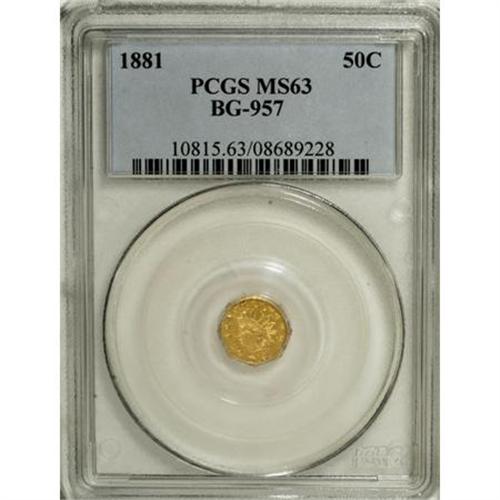 <B>1881 50C Indian Octagonal 50 Cents, BG-957, Low R.6, MS63 PCGS.</B></I> PCGS Population (5/12). NGC Census: (0/0). (#10815)<BR><BR><b>Shipping:</b> Coins & Currency (<a target="_blank" href="http://www.heritageauctions.com/common/shipping.php">view shipping information</a>)