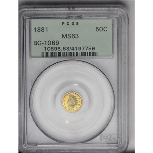 <B>1881<50C> Indian Round 50 Cents, BG-1069, High R.4, MS63 PCGS.</B></I> Bright and prooflike with a lightly patinated appearance. The reverse has an intermittently rough surface resulting from a die that was not properly polished. The design is well executed. A bit softly struck in the reverse center. A pleasing example.