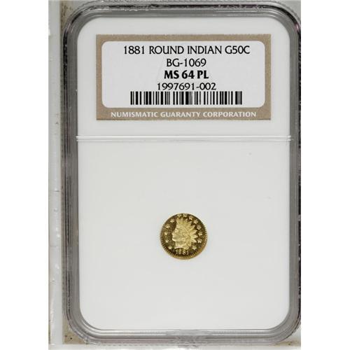 <B>1881<50C> Indian Round 50 Cents, BG-1069, High R.4, MS64 Prooflike NGC.</B></I> The radiant devices exhibit pleasing contrast with the strongly mirrored fields. Slight softness on the central reverse letters denies a full strike.