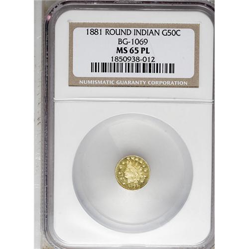 <B>1881<50C> Indian Round 50 Cents, BG-1069, High R.4, MS65 Prooflike NGC.</B></I> Boldly struck with deep mirrors. Some slight planchet roughness is noted on the reverse, but this is not major. Census: 2 in 65 Prooflike, 0 finer (8/06).