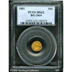 <B>1881 50C Indian Round 50 Cents, BG-1069, High R.4, MS62 PCGS.</B></I> Orange-gold color dominates, although the highpoints of the Indian feature ruby-red hues. A couple of letters on the central reverse are faint, due to metal flow to the portrait during the strike. Lot:9818