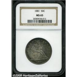 <B>1881 50C MS65 NGC.</B></I> Waves of apple-green, rose-red, and pearl-gray color alternate across this sharply struck and bagmark-free Gem. Only 10,000 pieces were struck, since minor silver denominations of the era were neglected in favor of legislatively required Silver Dollar production. Shrewd collectors set aside examples, but few have persisted in high Mint State grades. Population: 8 in 65, 16 finer (2/05).