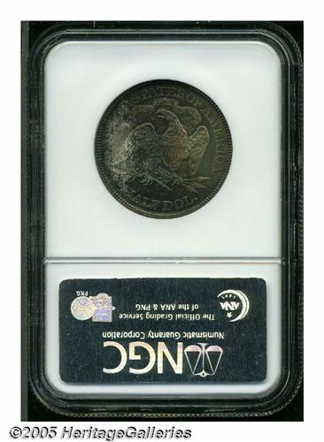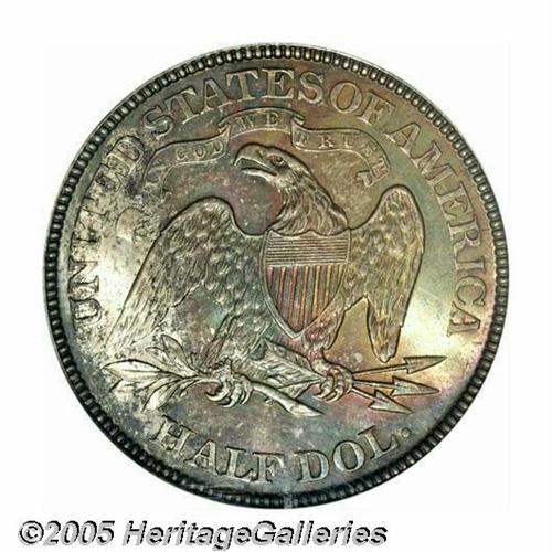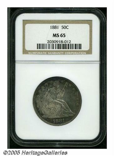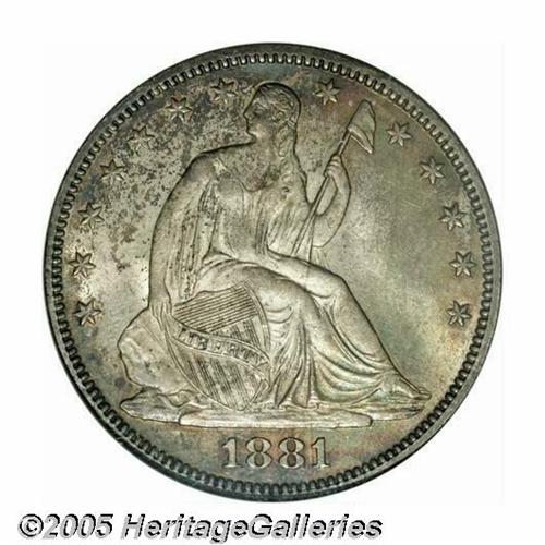 <B>1881<50C> MS65 NGC.</B></I> Waves of apple-green, rose-red, and pearl-gray color alternate across this sharply struck and mark-free Gem. Only 10,000 pieces were struck, since minor silver denominations of the era were neglected in favor of legislatively required Silver Dollar production. Shrewd collectors set aside examples, but few have survived in high Mint State grades. Population: 9 in 65, 16 finer (5/05).