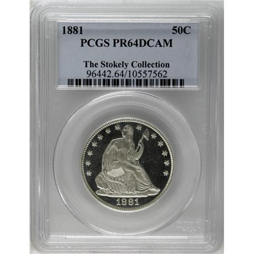 <B>1881<50C> PR64 Deep Cameo PCGS.</B></I> Type Two Reverse, identified by the close bases of the TAT in STATES. Chestnut toning lightly adorns the reverse, and is barely perceptible on the obverse. This reasonably struck near-Gem exhibits exceptional contrast between the Seated Liberty and the flashy obverse field. The grade is determined by a spot on the reverse rim at 2 o'clock, and an inconspicuous planchet flaw on Liberty's raised hand. Population: 2 in 64 Deep Cameo, 0 finer (6/06).<BR><I>From The Stephen Stokely #1 PCGS Registry Set of Proof Seated Half Dollars.</B></I>