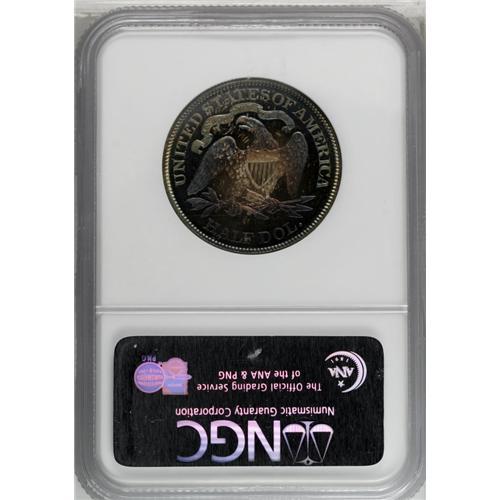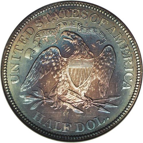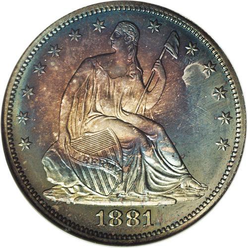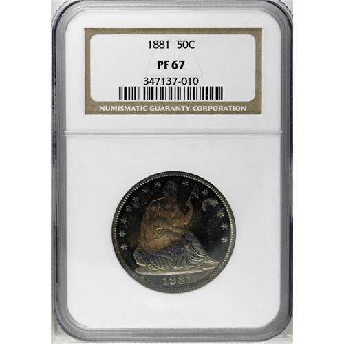 <B>1881<50C> PR67 NGC.</B></I> The business strike mintage of half dollars in this year was minute--10,000 pieces, to be precise--exerting added pressure on the 975 proof coins issued from date collectors. This example is a prize for the color collectors, mixing sunset-orange and magenta in the center with electric blue and jade-green at the peripheries. An arc of milky gray patina at star 10 is noted. Census: 4 in 67, 1 finer (6/06).