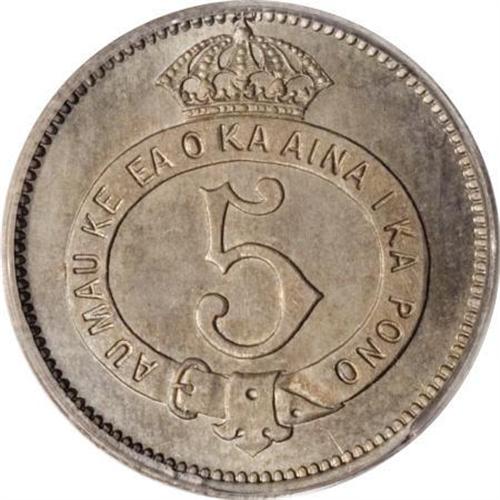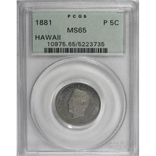 <B>1881 5C Hawaii Five Cents MS65 PCGS.</B></I> Medcalf 2CN-1. KM-2. In 1881, King Kalakaua of Hawaii became the first king to travel around the world. Among other nations, he visited the United States, Japan, China, India, Egypt, Italy, Belgium, Germany, Austria, France, Spain, and Great Britain. He had several reasons for his tour. He encouraged immigration to Hawaii, which needed workers for its sugar cane industry. He sought furnishings for his lavish royal palace. He was also interested in awarding a coinage contract, since no coins had been struck for Hawaii since 1847.<BR> As a result of the king's visit to Paris, German-silver five kenata patterns were struck by the owner of a New Caledonia nickel mine. These were shipped to the king for his approval, but he rejected them and instead contracted the United States to provide 1883 silver coins. Perhaps the reason for the rejection was a misspelling of the first word in the Hawaiian royal motto, UA MAU KE EA O KA AINA I KA PONO (The life of the land is perpetuated in righteousness). This motto stretched across the garter on the reverse of the pattern, which was surmounted by a crown topped by a cross. (The rarity of the 1881 patterns encouraged a circa-1900 Canadian copy, identified by a small ball atop the crown instead of a cross).<BR> The obverse of the pattern features a bust left of King Kalakaua, rather similar to the bust right seen on the more-familiar 1883 coinage. The obverse legend contains a second blunder, referring to Kalakaua as the KING OF SANDWICH ISLANDS instead of Hawaii. The Sandwich Islands was the European name for Hawaii. HAWAII appeared on the 1847 cent and on the 1883 coins.<BR> Although 200 1881 patterns were struck, few made it into numismatic holdings. According to Medcalf, "many of the coins became pocket pieces or were fashioned into jewelry." Lot 1159 in our 2007 FUN Signature was a group of canceled 1881 pattern fragments. PCGS and NGC combined have certified a total of 21 pieces, one per year of the services' existence, although this number is possibly inflated by resubmissions.<BR> Heritage auction archives locate only a few prior offerings. The present Gem provides a major opportunity for the Hawaiian specialist. It is intricately struck and exhibits medium golden-gray toning. The surfaces are flawless aside from a mint-made lintmark at 5:30 on the reverse. Certified in a green label holder. Listed on page 380 of the 2008 <I>Guide Book.</B></I> Population: 3 in 65, 1 finer (11/07).<BR><BR><b>Shipping:</b> Coins & Currency (<a target="_blank" href="http://www.heritageauctions.com/common/shipping.php">view shipping information</a>)
