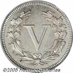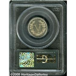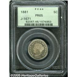 <B>1881 5C Liberty Head Five Cents, Judd-1671, Pollock-1872, High R.6 PR65 PCGS.</B></I> An early prototype for the Liberty nickel that was adopted two years later. This version differs in several ways from the regular design. On the obverse UNITED STATES OF AMERICA circles the rim in place of the stars. On the reverse, a large V is surrounded by a wreath with no statutory inscriptions around the periphery. Struck in nickel with a plain edge. A needle-sharp Gem that has gorgeous surfaces and dusky pearl-gray and golden patina. A wonderful specimen of this important transitional design. The dies are slightly rotated counterclockwise. Population: 3 in 65, 0 finer (2/05).