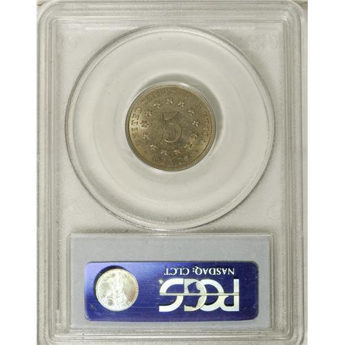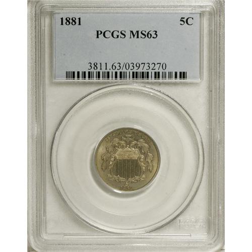 <B>1881 5C MS63 PCGS.</B></I> Well struck with pleasing satin luster and lovely light coloration. Few marks are found on either side, but scattered flyspecks are observed across the reverse.<BR><BR><b>Shipping:</b> Coins & Currency (<a target="_blank" href="http://www.heritageauctions.com/common/shipping.php">view shipping information</a>)