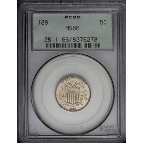 <B>1881<5C> MS66 PCGS.</B></I> A bold striking with a curious mixture of semi-reflective luster and subtle graininess that is most evident on the reverse. Light patina over each side is perhaps responsible for this dual-textured finish. The business strike mintage of this scarce date was limited to 68,800 pieces and only a few dozen Gem or better survivors are available today. Population: 12 in 66, 5 finer (3/06). <BR><BR><B>Important notice:</B> Heritage usually auctions material at the rate of 200-250 lots per hour. On some occasions eBay Live bid software or the Internet may not be able to keep up with the pace of the auction. We recommend placing a realistic absentee bid now as insurance to avoid disappointment. Occasionally the auctioneer may eliminate or reject an eBay Live bid, and the auctioneer may also reopen a lot after the close of the eBay live bidding (usually because we missed an audience bid), and may reject your bid even if it shows you as the winning bidder. By bidding via eBay Live, you agree that Heritage may award the lot to another bidder at its sole discretion under the circumstances described above or any other reasonable circumstances. Since eBay bids are not shown to us until we open the lot on the floor, we treat those bids just like floor bids. In most cases the floor responds before the eBay bid is presented to us, due to Internet lag time, so for consistency we have made it a policy that floor bids are always considered first over tie eBay live bids. Also please note that all Heritage lots purchased through eBay Live carry a 20% Buyer's Premium. Please make sure you read the Terms and Conditions before you bid. This lot is being auctioned in conjunction with a live floor auction by Heritage Galleries & Auctioneers. All final auction and invoice information will be supplied by Heritage Galleries & Auctioneers, and all other information should be considered preliminary. Lot:865 <BR><BR><B>Winning Notification and Billing:</B> After the FINAL session in this auction is complete, Heritage will send e-mail and snail mail invoices. This process normally takes several days. All final auction and invoice information will be supplied by Heritage Galleries & Auctioneers, and all other information should be considered preliminary. <BR><BR>This auction will be conducted on a live auction floor and over the Internet through eBay Live. If you choose to place an absentee bid, please take a moment to <font color='#0000ff'><u><a href='http://pages.ebay.com/liveauctions/help/before/laabsentee.html'>learn how eBay Live absentee bidding works</a></u></font><font color='#000000'>