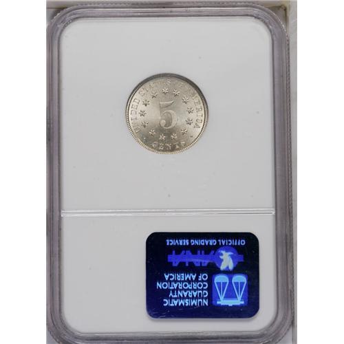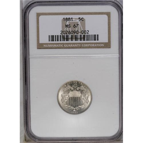 <B>1881<5C> MS67 NGC.</B></I> Fletcher-1. The date is widely repunched south. The 1881 has a low business strike mintage of only 68,800 pieces, and high grade survivors of this production are very rare. Fletcher-1 is a die pairing unknown to proofs, and the numerous slender die cracks further attest to its business strike origin. This lustrous and lightly toned Superb Gem has a penetrating strike and exemplary surfaces.