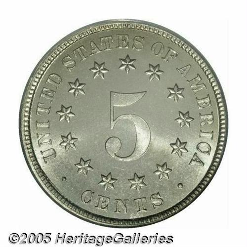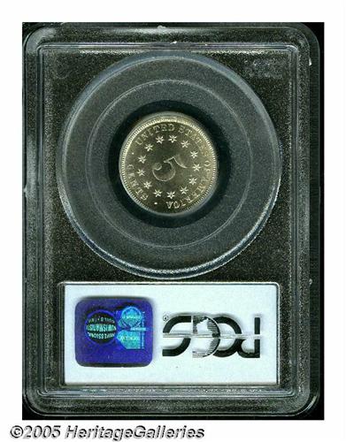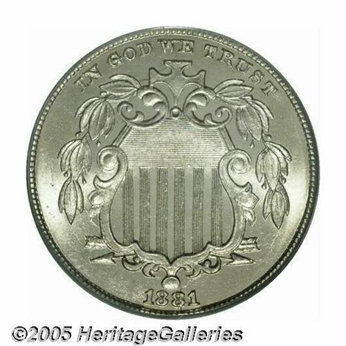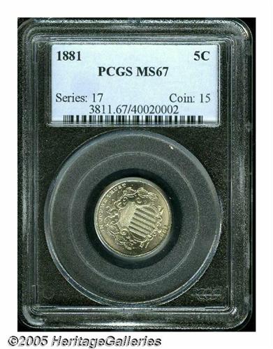 <B>1881<5C> MS67 PCGS.</B></I> The government's stockpile of nickels became exhausted in 1881, but this did not happen until very late in the year. Since the Secretary of the Treasury ordered the Philadelphia Mint to resume production of this denomination on November 12, and the first coins were not delivered until December 12, it is little wonder that the original mintage for the 1881 amounted to just 68,800 business strikes. This Superb example is unsurpassable in grade at either NGC or PCGS. Pinpoint striking definition is noted throughout, but distracting abrasions and carbon are conspicuous by their absence. The untoned features allow full appreciation of the shimmering mint luster. Combined NGC and PCGS Population: 10 in 67, 0 finer (4/05).<BR><I>From The Western Hills Collection.</B></I>