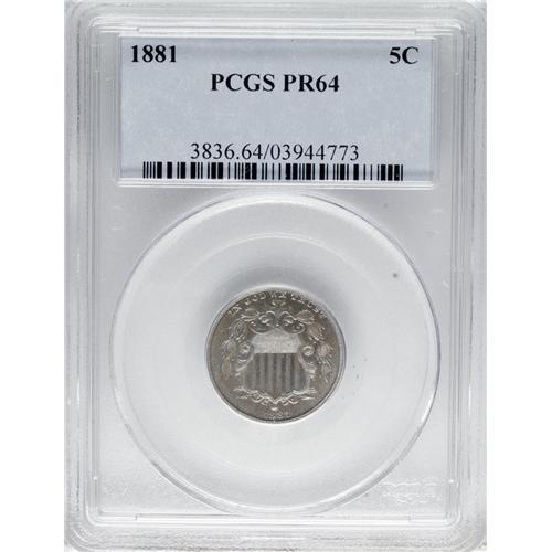 <B>1881 5C PR64 PCGS.</B></I> PCGS Population (231/429). NGC Census: (298/820). Mintage: 3,575. Numismedia Wsl. Price for NGC/PCGS coin in PR64: $332. (#3836)<BR><BR><b>Shipping:</b> Coins & Currency (<a target="_blank" href="http://www.heritageauctions.com/common/shipping.php">view shipping information</a>)