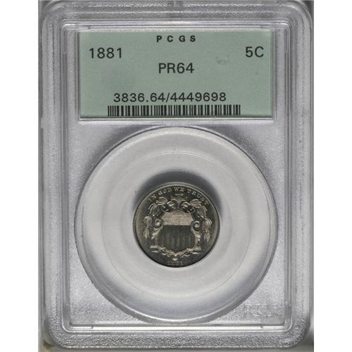 <B>1881<5C> PR64 PCGS.</B></I> Pastel apricot and sky-blue hues embrace this intricately struck and undisturbed near-Gem. A low mintage date. Housed in a green label holder.<BR><I>From The Chief Paduke Collection.</B></I>