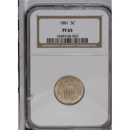 <B>1881<5C> PR65 NGC.</B></I> The obverse has lovely sunset-orange patina, while the reverse is toned olive-green. A beautiful Gem with great detail and moderate reflectivity.