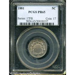 <B>1881 5C PR65 PCGS.</B></I> Speckles of olive-gold color adhere to nicely preserved surfaces. Lot:5857