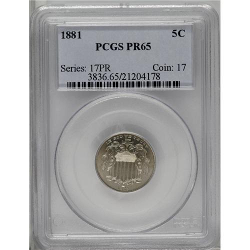 <B>1881<5C> PR65 PCGS.</B></I> The second 8 in the date appears to be lightly repunched within the upper portion of the lower loop. Both sides have tiny scattered flecks of charcoal patina. A well struck Gem that has relentlessly unblemished surfaces. <BR><BR><B>Important notice:</B> Heritage usually auctions material at the rate of 200-250 lots per hour. On some occasions eBay Live bid software or the Internet may not be able to keep up with the pace of the auction. We recommend placing a realistic absentee bid now as insurance to avoid disappointment. Occasionally the auctioneer may eliminate or reject an eBay Live bid, and the auctioneer may also reopen a lot after the close of the eBay live bidding (usually because we missed an audience bid), and may reject your bid even if it shows you as the winning bidder. By bidding via eBay Live, you agree that Heritage may award the lot to another bidder at its sole discretion under the circumstances described above or any other reasonable circumstances. Since eBay bids are not shown to us until we open the lot on the floor, we treat those bids just like floor bids. In most cases the floor responds before the eBay bid is presented to us, due to Internet lag time, so for consistency we have made it a policy that floor bids are always considered first over tie eBay live bids. Also please note that all Heritage lots purchased through eBay Live carry a 20% Buyer's Premium. Please make sure you read the Terms and Conditions before you bid. This lot is being auctioned in conjunction with a live floor auction by Heritage Galleries & Auctioneers. All final auction and invoice information will be supplied by Heritage Galleries & Auctioneers, and all other information should be considered preliminary. Lot:898 <BR><BR><B>Winning Notification and Billing:</B> After the FINAL session in this auction is complete, Heritage will send e-mail and snail mail invoices. This process normally takes several days. All final auction and invoice information will be supplied by Heritage Galleries & Auctioneers, and all other information should be considered preliminary. <BR><BR>This auction will be conducted on a live auction floor and over the Internet through eBay Live. If you choose to place an absentee bid, please take a moment to <font color='#0000ff'><u><a href='http://pages.ebay.com/liveauctions/help/before/laabsentee.html'>learn how eBay Live absentee bidding works</a></u></font><font color='#000000'>