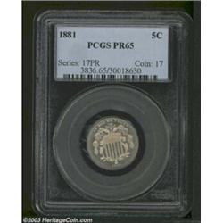 <TR><TD width="100%"><TABLE cellSpacing=1 cellPadding=3 width="100%" border=0><TBODY><TR><TD width="100%" bgColor=#79735c><FONT face=arial color=#ffffff size=3><B>Description</B> </FONT></TD></TR><TR><TD width="100%" bgColor=#ffffff><FONT face=arial size=2><B>1881 5C PR65 PCGS.</B></I> An even and light red yellow flashes across the surfaces of this attractive proof. A very small planchet flaw near the 2 o'clock rim is the only distraction. </FONT></TD></TR></TBODY></TABLE></TD></TR></TBODY></TABLE><BR><A name=PricesRealized></A><TABLE cellSpacing=0 cellPadding=0 width="100%" bgColor=#000000 border=0><TBODY><TR><TD width="100%"><TABLE cellSpacing=1 cellPadding=3 width="100%" border=0><TBODY><TR><TD width="100%" bgColor=#79735c><A name=PR><FONT face=arial color=#ffffff size=3><B>Previous Prices from Heritage Auctions</B> </FONT></A></TD></TR><TR><TD bgColor=#f6f6ed><TABLE cellSpacing=0 cellPadding=0 width="100%" border=1><TBODY><TR><TD align=middle width="33%"><B>Date</B></TD><TD align=middle width="33%"><B>Service</B></TD><TD align=middle width="33%"><B>Price</B></TD></TR><TR bgColor=whitesmoke><TD width="33%"><B>03/12/1993</B></TD><TD width="33%">PCGS</TD><TD width="33%">$610.50</TD></TR><TR bgColor=whitesmoke><TD width="33%"><B>06/02/1995</B></TD><TD width="33%">PCGS</TD><TD width="33%">$522.50</TD></TR><TR bgColor=whitesmoke><TD width="33%"><B>03/12/1993</B></TD><TD width="33%">PCGS</TD><TD width="33%">$660.00</TD></TR><TR bgColor=whitesmoke><TD width="33%"><B>10/01/1996</B></TD><TD width="33%">PCGS</TD><TD width="33%">$550.00</TD></TR><TR bgColor=whitesmoke><TD width="33%"><B>06/01/2000</B></TD><TD width="33%">PCGS</TD><TD width="33%">$506.00</TD></TR><TR bgColor=whitesmoke><TD width="33%"><B>01/05/2001</B></TD><TD width="33%">NGC</TD><TD width="33%">$529.00</TD></TR><TR bgColor=whitesmoke><TD width="33%"><B>11/12/1993</B></TD><TD width="33%">NGC</TD><TD width="33%">$495.00</TD></TR><TR bgColor=whitesmoke><TD width="33%"><B>01/09/1999</B></TD><TD width="33%">NGC</TD><TD width="33%">$550.00</TD></TR><TR bgColor=whitesmoke><TD width="33%"><B>08/07/2000</B></TD><TD width="33%">NGC</TD><TD width="33%">$517.50</TD></TR><TR bgColor=whitesmoke><TD width="33%"><B>06/07/2000</B></TD><TD width="33%">NGC</TD><TD width="33%">$391.00</TD></TR><TR bgColor=whitesmoke><TD width="33%"><B>05/31/2003</B></TD><TD width="33%">PCGS</TD><TD width="33%">$431.25</TD></TR><TR bgColor=whitesmoke><TD width="33%"><B>10/08/2002</B></TD><TD width="33%">PCGS</TD><TD width="33%">$460.00</TD></TR><TR bgColor=whitesmoke><TD width="33%"><B>10/02/2000</B></TD><TD width="33%">PCGS</TD><TD width="33%">$506.00</TD></TR><TR bgColor=whitesmoke><TD width="33%"><B>01/12/2002</B></TD><TD width="33%">PCGS</TD><TD width="33%">$517.50</TD></TR><TR bgColor=whitesmoke><TD width="33%"><B>02/23/2001</B></TD><TD width="33%">PCGS</TD><TD width="33%">$488.75</TD></TR><TR bgColor=whitesmoke><TD width="33%"><B>12/08/1995</B></TD><TD width="33%">PCGS</TD><TD width="33%">$440.00</TD></TR><TR bgColor=whitesmoke><TD width="33%"><B>08/17/1996</B></TD><TD width="33%">PCGS</TD><TD width="33%">$550.00</TD></TR><TR bgColor=whitesmoke><TD width="33%"><B>02/02/1994</B></TD><TD width="33%">PCGS</TD><TD width="33%">$495.00</TD></TR><TR bgColor=whitesmoke><TD width="33%"><B>05/01/1995</B></TD><TD width="33%">ANACS</TD><TD width="33%">$770.00</TD></TR></TBODY></TABLE></TD></TR><TR><TD bgColor=#ffffff><FONT face=arial size=1 ?>PLEASE NOTE: All prices realized reflect the final hammer price PLUS the buyer's premium in auctions that charge a buyer's premium. Each item has a notation at the top of the listing indicating whether that lot included a buyer's premium. Example: A item that sells with a final hammer price of $100 and a 20% buyer's premium will display with a price realized of $120. All information listed is intended to be as accurate as possible, but errors are possible. Please use this guide carefully and inform us of any inaccuracies. </FONT></TD></TR></TBODY></TABLE></TD></TR></TBODY></TABLE><BR><TABLE cellSpacing=0 cellPadding=0 width="100%" bgColor=#000000 border=0><TBODY><TR><TD width="100%"><TABLE cellSpacing=1 cellPadding=3 width="100%" border=0><TBODY><TR><TD width="100%" bgColor=#79735c colSpan=6><FONT face=arial color=#ffffff size=3><B>Price Guide*</B> </FONT></TD></TR><TR bgColor=#f6f6ed><TD align=middle><B>Grade</B> </TD><TD align=middle><B>Coin World<BR>(Trends)</B> </TD><TD align=middle><B>Numismedia<BR>Retail</B> </TD><TD align=middle><B>Numismedia<BR>Wholesale</B> </TD><TD align=middle><B>Coin<BR>Universe</B> </TD><TD align=middle><B>Heritage<BR>Value Index</B> </TD></TR><TR bgColor=#ffffff><TD align=middle>64</TD><TD align=right>---</TD><TD align=right>$390.00</TD><TD align=right>$312.00</TD><TD align=right>$365.00</TD><TD align=right>$250.83</TD></TR><TR style="FONT-WEIGHT: bold" bgColor=#cccfdd><TD align=middle>65</TD><TD align=right>---</TD><TD align=right>$650.00</TD><TD align=right>$520.00</TD><TD align=right>$650.00</TD><TD align=right>$442.50</TD></TR><TR bgColor=#ffffff><TD align=middle>66</TD><TD align=right>---</TD><TD align=right>---</TD><TD align=right>$775.00</TD><TD align=right>$950.00</TD><TD align=right>$653.13</TD></TR><TR bgColor=#ffffff><TD colSpan=6><FONT size=1>*All information listed is intended to be as accurate as possible, but errors are possible. No item may be returned or refused based on this information which is provided as a service to our customers. You should contact each pricing source directly to determine the accuracy of this information. </FONT></TD></TR></TBODY></TABLE></TD></TR></TBODY></TABLE><BR><TABLE cellSpacing=0 cellPadding=0 width="100%" bgColor=#000000 border=0><TBODY><TR><TD width="100%"><TABLE cellSpacing=1 cellPadding=3 width="100%" border=0><TBODY><TR><TD width="100%" bgColor=#79735c><FONT face=arial color=#ffffff size=3><B>Population Guide</B> </FONT></TD></TR><TR bgColor=#ffffff><TD align=middle><!-- Begin Output of Population Grid--><TABLE cellSpacing=0 cellPadding=0 width="100