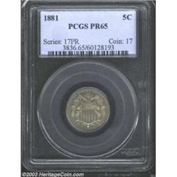 <TABLE cellSpacing=0 cellPadding=0 width="100%" bgColor=#000000 border=0><TBODY><TR><TD width="100%"><TABLE cellSpacing=1 cellPadding=3 width="100%" border=0><TBODY><TR><TD width="100%" bgColor=#79735c><FONT face=arial color=#ffffff size=3><B>Description</B> </FONT></TD></TR><TR><TD width="100%" bgColor=#ffffff><FONT face=arial size=2><B>1881 5C PR65 PCGS.</B></I> The second 8 in the date is recut within the lower loop. A nicely struck and carefully preserved specimen with deep apple-green or lilac colors. The lower reverse has a few very faint hairlines. A low mintage date. </FONT></TD></TR></TBODY></TABLE></TD></TR></TBODY></TABLE><BR><A name=PricesRealized></A><TABLE cellSpacing=0 cellPadding=0 width="100%" bgColor=#000000 border=0><TBODY><TR><TD width="100%"><TABLE cellSpacing=1 cellPadding=3 width="100%" border=0><TBODY><TR><TD width="100%" bgColor=#79735c><A name=PR><FONT face=arial color=#ffffff size=3><B>Previous Prices from Heritage Auctions</B> </FONT></A></TD></TR><TR><TD bgColor=#f6f6ed><TABLE cellSpacing=0 cellPadding=0 width="100%" border=1><TBODY><TR><TD align=middle width="33%"><B>Date</B></TD><TD align=middle width="33%"><B>Service</B></TD><TD align=middle width="33%"><B>Price</B></TD></TR><TR bgColor=whitesmoke><TD width="33%"><B>03/12/1993</B></TD><TD width="33%">PCGS</TD><TD width="33%">$610.50</TD></TR><TR bgColor=whitesmoke><TD width="33%"><B>11/22/1996</B></TD><TD width="33%">PCGS</TD><TD width="33%">$429.00</TD></TR><TR bgColor=whitesmoke><TD width="33%"><B>06/02/1995</B></TD><TD width="33%">PCGS</TD><TD width="33%">$522.50</TD></TR><TR bgColor=whitesmoke><TD width="33%"><B>02/03/1995</B></TD><TD width="33%">PCGS</TD><TD width="33%">$496.10</TD></TR><TR bgColor=whitesmoke><TD width="33%"><B>03/12/1993</B></TD><TD width="33%">PCGS</TD><TD width="33%">$660.00</TD></TR><TR bgColor=whitesmoke><TD width="33%"><B>03/01/1996</B></TD><TD width="33%">PCGS</TD><TD width="33%">$523.00</TD></TR><TR bgColor=whitesmoke><TD width="33%"><B>10/01/1996</B></TD><TD width="33%">PCGS</TD><TD width="33%">$550.00</TD></TR><TR bgColor=whitesmoke><TD width="33%"><B>02/24/2001</B></TD><TD width="33%">NGC</TD><TD width="33%">$460.00</TD></TR><TR bgColor=whitesmoke><TD width="33%"><B>01/05/2001</B></TD><TD width="33%">NGC</TD><TD width="33%">$529.00</TD></TR><TR bgColor=whitesmoke><TD width="33%"><B>03/19/1997</B></TD><TD width="33%">NGC</TD><TD width="33%">$396.00</TD></TR><TR bgColor=whitesmoke><TD width="33%"><B>11/12/1993</B></TD><TD width="33%">NGC</TD><TD width="33%">$495.00</TD></TR><TR bgColor=whitesmoke><TD width="33%"><B>10/31/2000</B></TD><TD width="33%">NGC</TD><TD width="33%">$400.00</TD></TR><TR bgColor=whitesmoke><TD width="33%"><B>01/09/1999</B></TD><TD width="33%">NGC</TD><TD width="33%">$550.00</TD></TR><TR bgColor=whitesmoke><TD width="33%"><B>06/04/1999</B></TD><TD width="33%">NGC</TD><TD width="33%">$690.00</TD></TR><TR bgColor=whitesmoke><TD width="33%"><B>08/07/2000</B></TD><TD width="33%">NGC</TD><TD width="33%">$517.50</TD></TR><TR bgColor=whitesmoke><TD width="33%"><B>09/10/1997</B></TD><TD width="33%">NGC</TD><TD width="33%">$352.00</TD></TR><TR bgColor=whitesmoke><TD width="33%"><B>06/07/2000</B></TD><TD width="33%">NGC</TD><TD width="33%">$391.00</TD></TR><TR bgColor=whitesmoke><TD width="33%"><B>03/23/2003</B></TD><TD width="33%">PCGS</TD><TD width="33%">$862.50</TD></TR><TR bgColor=whitesmoke><TD width="33%"><B>07/29/2003</B></TD><TD width="33%">PCGS</TD><TD width="33%">$425.50</TD></TR><TR bgColor=whitesmoke><TD width="33%"><B>05/31/2003</B></TD><TD width="33%">PCGS</TD><TD width="33%">$431.25</TD></TR><TR bgColor=whitesmoke><TD width="33%"><B>12/14/2002</B></TD><TD width="33%">PCGS</TD><TD width="33%">$478.40</TD></TR><TR bgColor=whitesmoke><TD width="33%"><B>10/08/2002</B></TD><TD width="33%">PCGS</TD><TD width="33%">$460.00</TD></TR><TR bgColor=whitesmoke><TD width="33%"><B>09/28/2002</B></TD><TD width="33%">PCGS</TD><TD width="33%">$488.75</TD></TR><TR bgColor=whitesmoke><TD width="33%"><B>10/02/2000</B></TD><TD width="33%">PCGS</TD><TD width="33%">$506.00</TD></TR><TR bgColor=whitesmoke><TD width="33%"><B>02/12/2002</B></TD><TD width="33%">PCGS</TD><TD width="33%">$494.50</TD></TR><TR bgColor=whitesmoke><TD width="33%"><B>01/12/2002</B></TD><TD width="33%">PCGS</TD><TD width="33%">$517.50</TD></TR><TR bgColor=whitesmoke><TD width="33%"><B>05/08/2001</B></TD><TD width="33%">PCGS</TD><TD width="33%">$460.00</TD></TR><TR bgColor=whitesmoke><TD width="33%"><B>02/23/2001</B></TD><TD width="33%">PCGS</TD><TD width="33%">$488.75</TD></TR><TR bgColor=whitesmoke><TD width="33%"><B>09/26/2000</B></TD><TD width="33%">PCGS</TD><TD width="33%">$480.00</TD></TR><TR bgColor=whitesmoke><TD width="33%"><B>12/08/1995</B></TD><TD width="33%">PCGS</TD><TD width="33%">$440.00</TD></TR><TR bgColor=whitesmoke><TD width="33%"><B>03/04/1995</B></TD><TD width="33%">PCGS</TD><TD width="33%">$550.00</TD></TR><TR bgColor=whitesmoke><TD width="33%"><B>08/17/1996</B></TD><TD width="33%">PCGS</TD><TD width="33%">$550.00</TD></TR><TR bgColor=whitesmoke><TD width="33%"><B>03/21/1998</B></TD><TD width="33%">PCGS</TD><TD width="33%">$431.25</TD></TR><TR bgColor=whitesmoke><TD width="33%"><B>02/02/1994</B></TD><TD width="33%">PCGS</TD><TD width="33%">$495.00</TD></TR><TR bgColor=whitesmoke><TD width="33%"><B>09/01/1997</B></TD><TD width="33%">PCGS</TD><TD width="33%">$688.00</TD></TR><TR bgColor=whitesmoke><TD width="33%"><B>06/01/2000</B></TD><TD width="33%">PCGS</TD><TD width="33%">$506.00</TD></TR><TR bgColor=whitesmoke><TD width="33%"><B>06/01/2000</B></TD><TD width="33%">NGC</TD><TD width="33%">$529.00</TD></TR><TR bgColor=whitesmoke><TD width="33%"><B>05/01/1995</B></TD><TD width="33%">ANACS</TD><TD width="33%">$770.00</TD></TR></TBODY></TABLE></TD></TR><TR><TD bgColor=#ffffff><FONT face=arial size=1 ?>PLEASE NOTE: All prices realized reflect the final hammer price PLUS the buyer's premium in auctions that charge a buyer's premium. Each item has a notation at the top of the listing ind