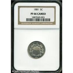 <B>1881 5C PR66 Cameo NGC.</B></I> Exquisitely struck, with bright, nickel-gray surfaces that are nearly perfect. Population: 25 in 66, 16 finer (1/05). Lot:5860