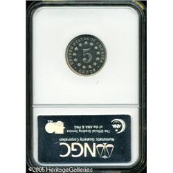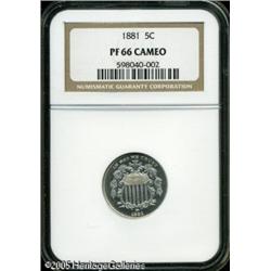 <B>1881 5C PR66 Cameo NGC.</B></I> Fully struck with startling reflectivity in the polished proof fields, and a few flyspecks scattered over each side. Population: 25 in PR66 Cameo, 17 finer (1/05). Lot:5861