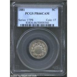 <TABLE cellSpacing=0 cellPadding=0 width="100%" bgColor=#000000 border=0><TBODY><TR><TD width="100%"><TABLE cellSpacing=1 cellPadding=3 width="100%" border=0><TBODY><TR><TD width="100%" bgColor=#79735c><FONT face=arial color=#ffffff size=3><B>Description</B> </FONT></TD></TR><TR><TD width="100%" bgColor=#ffffff><FONT face=arial size=2><B>1881 5C PR66 Cameo PCGS.</B></I> The second 8 in the date is clearly recut. Pastel lilac and gold colors endow this well struck and magnificently preserved Gem. The low business strike production increases the demand for high grade proofs. Population: 19 in 66 as Cameo, 3 finer (4/03). </FONT></TD></TR></TBODY></TABLE></TD></TR></TBODY></TABLE><BR><A name=PricesRealized></A><TABLE cellSpacing=0 cellPadding=0 width="100%" bgColor=#000000 border=0><TBODY><TR><TD width="100%"><TABLE cellSpacing=1 cellPadding=3 width="100%" border=0><TBODY><TR><TD width="100%" bgColor=#79735c><A name=PR><FONT face=arial color=#ffffff size=3><B>Previous Prices from Heritage Auctions</B> </FONT></A></TD></TR><TR><TD bgColor=#f6f6ed><TABLE cellSpacing=0 cellPadding=0 width="100%" border=1><TBODY><TR><TD align=middle width="33%"><B>Date</B></TD><TD align=middle width="33%"><B>Service</B></TD><TD align=middle width="33%"><B>Price</B></TD></TR><TR bgColor=whitesmoke><TD width="33%"><B>03/18/2003</B></TD><TD width="33%">PCGS</TD><TD width="33%">$718.75</TD></TR><TR bgColor=whitesmoke><TD width="33%"><B>11/23/2002</B></TD><TD width="33%">PCGS</TD><TD width="33%">$776.25</TD></TR><TR bgColor=whitesmoke><TD width="33%"><B>11/23/2002</B></TD><TD width="33%">PCGS</TD><TD width="33%">$776.25</TD></TR><TR bgColor=whitesmoke><TD width="33%"><B>10/29/2002</B></TD><TD width="33%">PCGS</TD><TD width="33%">$833.75</TD></TR><TR bgColor=whitesmoke><TD width="33%"><B>09/28/2002</B></TD><TD width="33%">PCGS</TD><TD width="33%">$776.25</TD></TR><TR bgColor=whitesmoke><TD width="33%"><B>07/29/2002</B></TD><TD width="33%">PCGS</TD><TD width="33%">$1,265.00</TD></TR><TR bgColor=whitesmoke><TD width="33%"><B>07/30/2002</B></TD><TD width="33%">PCGS</TD><TD width="33%">$776.25</TD></TR><TR bgColor=whitesmoke><TD width="33%"><B>06/08/2002</B></TD><TD width="33%">PCGS</TD><TD width="33%">$805.00</TD></TR><TR bgColor=whitesmoke><TD width="33%"><B>04/27/2002</B></TD><TD width="33%">PCGS</TD><TD width="33%">$862.50</TD></TR><TR bgColor=whitesmoke><TD width="33%"><B>05/03/2003</B></TD><TD width="33%">PCGS</TD><TD width="33%">$833.75</TD></TR><TR bgColor=whitesmoke><TD width="33%"><B>02/18/2003</B></TD><TD width="33%">PCGS</TD><TD width="33%">$776.25</TD></TR><TR bgColor=whitesmoke><TD width="33%"><B>05/31/2003</B></TD><TD width="33%">NGC</TD><TD width="33%">$603.75</TD></TR></TBODY></TABLE></TD></TR><TR><TD bgColor=#ffffff><FONT face=arial size=1 ?>PLEASE NOTE: All prices realized reflect the final hammer price PLUS the buyer's premium in auctions that charge a buyer's premium. Each item has a notation at the top of the listing indicating whether that lot included a buyer's premium. Example: A item that sells with a final hammer price of $100 and a 20% buyer's premium will display with a price realized of $120. All information listed is intended to be as accurate as possible, but errors are possible. Please use this guide carefully and inform us of any inaccuracies. </FONT></TD></TR></TBODY></TABLE></TD></TR></TBODY></TABLE><BR><TABLE cellSpacing=0 cellPadding=0 width="100%" bgColor=#000000 border=0><TBODY><TR><TD width="100%"><TABLE cellSpacing=1 cellPadding=3 width="100%" border=0><TBODY><TR><TD width="100%" bgColor=#79735c colSpan=6><FONT face=arial color=#ffffff size=3><B>Price Guide*</B> </FONT></TD></TR><TR bgColor=#f6f6ed><TD align=middle><B>Grade</B> </TD><TD align=middle><B>Coin World<BR>(Trends)</B> </TD><TD align=middle><B>Numismedia<BR>Retail</B> </TD><TD align=middle><B>Numismedia<BR>Wholesale</B> </TD><TD align=middle><B>Coin<BR>Universe</B> </TD><TD align=middle><B>Heritage<BR>Value Index</B> </TD></TR><TR bgColor=#ffffff><TD align=middle>65</TD><TD align=right>---</TD><TD align=right>---</TD><TD align=right>---</TD><TD align=right>---</TD><TD align=right>$468.25</TD></TR><TR style="FONT-WEIGHT: bold" bgColor=#cccfdd><TD align=middle>66</TD><TD align=right>---</TD><TD align=right>---</TD><TD align=right>---</TD><TD align=right>---</TD><TD align=right>---</TD></TR><TR bgColor=#ffffff><TD align=middle>67</TD><TD align=right>---</TD><TD align=right>---</TD><TD align=right>---</TD><TD align=right>---</TD><TD align=right>---</TD></TR><TR bgColor=#ffffff><TD colSpan=6><FONT size=1>*All information listed is intended to be as accurate as possible, but errors are possible. No item may be returned or refused based on this information which is provided as a service to our customers. You should contact each pricing source directly to determine the accuracy of this information. </FONT></TD></TR></TBODY></TABLE></TD></TR></TBODY></TABLE><BR><TABLE cellSpacing=0 cellPadding=0 width="100%" bgColor=#000000 border=0><TBODY><TR><TD width="100%"><TABLE cellSpacing=1 cellPadding=3 width="100%" border=0><TBODY><TR><TD width="100%" bgColor=#79735c><FONT face=arial color=#ffffff size=3><B>Population Guide</B> </FONT></TD></TR><TR bgColor=#ffffff><TD align=middle><!-- Begin Output of Population Grid--><TABLE cellSpacing=0 cellPadding=0 width="100%" border=0><TBODY><TR><TD vAlign=center><TABLE cellSpacing=0 width="100%" border=1 cellsadding="3"><TBODY><TR><TD vAlign=center><TABLE cellSpacing=0 cellPadding=3 width="100%" border=1><TBODY><TR><TD vAlign=center align=middle bgColor=#f0f1e8 colSpan=2 <CENTER><FONT face=Arial size=2><B>PCGS Pop </B></FONT><CENTER></CENTER></TD><TD vAlign=center align=middle bgColor=#f0f1e8 colSpan=2><CENTER><FONT face=Arial size=2><B>NGC Pop</B></CENTER></FONT></TD></TR><TR><TD vAlign=center><FONT face=Arial size=2>(66)</FONT> </TD><TD vAlign=center align=right><FONT face=Arial size=2>16</FONT> </TD><TD vAlign=center><FONT face=Arial size=2>(66)</FONT> </TD><TD vAlign=center align=right><FONT