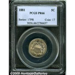 <B>1881 5C PR66 PCGS.</B></I> A beautiful honey-gold premium Gem, hints of rose-lilac color also visit the reverse. Well struck, and virtually free from contact or carbon. The second 8 in the date is lightly recut.