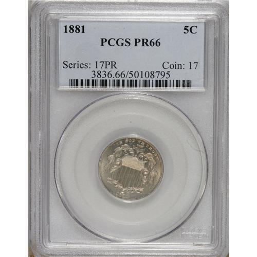 <B>1881 5C PR66 PCGS.</B></I> An attractive example of this later Shield nickel proof issue, made more important by its corresponding business strike mintage of just 68,800 pieces. Thin washes of blue and gold grace most of the gleaming surfaces, while small spots of steel-gray appear at the upper reverse.<BR><BR><b>Shipping:</b> Coins & Currency (<a target="_blank" href="http://www.heritageauctions.com/common/shipping.php">view shipping information</a>)